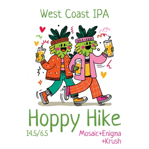 Hoppy Hike — это энергичный West Coast IPA, созданный для тех, кто любит двигаться вперёд и открывать новые вкусовые тропы. Линейка меняет хмели от версии к версии, но неизменно остаётся яркой, хрустящей и наполненной приключенческим настроением. В первом выпуске путь проложен через Mosaic, Enigma и Krush — хмели, дарящие сочные фруктовые акценты, цитрусовые вспышки и чистую горечь. Идеальный ипа, чтобы отправиться в свой собственный хмельной поход.