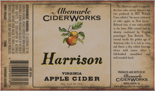 Dry single varietal of the Harrison apple. Full-bodied and crisp with notes of baked apple and honeyed pear.