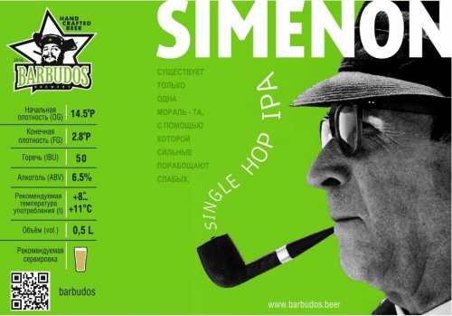 Однохмелевой индийский пэйл эль, изготовленный из крутого американского хмеля Simcoe с главной хмелеводческой фермы округа Якима штата Вашингтон. В мае 2020 года SINGLE HOP IPA SIMCOE (теперь SIMENON) стал финалистом конкурса предпочтений среди поклонников пива BARBUDOS, уступив только NEIPA Iroqués.