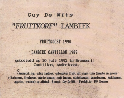 Real lambic, garden fruit (black & green elderberries, raspberries, black currants, red currants, red berries, gooseberries, jostaberries, apples & plums) on alcohol. Recipe: Guy de Wit, Production: 149 bottles