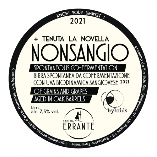 grains and grapes hybrid from spontaneous co-fermentation of organic barley, organic wheat of evolutionary population and sangiovese biodynamic grapes from Tenuta La Novella, Chianti Classico, Tuscany. The grapes were harvested by ourselves, stomped by feet and added to the beer wort the same day in which it was brewed. No added microorganisms, no brett, no yeast, no sour pitch. Fermentation is just the result of the action of the microorganisms that live on the skins of the grapes.